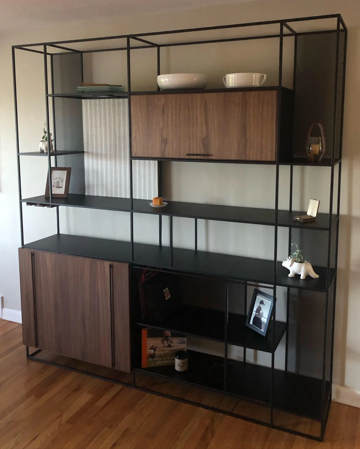 Custom pulls and sliding door hardware. Walnut doors. LED lighting. 2-piece unit joined in the middle. Powder coat finish. Design & build.